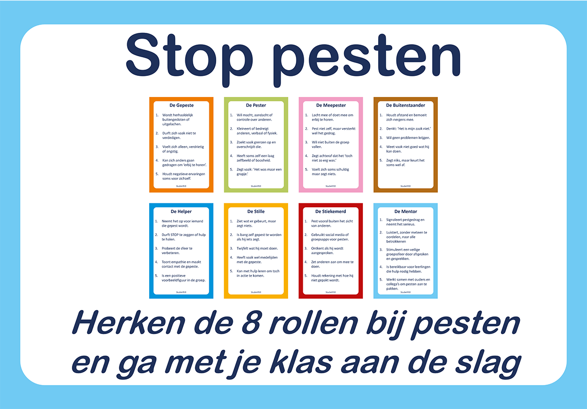 De rollenkaarten bestaan uit 7 rollen die bij pestgedrag kunnen voorkomen. De 8e rol is voor jou als mentor weggelegd. Bespreek met je klas wat zij nodig hebben van jou als mentor in pestsituaties en maak duidelijke afspraken over het signaleren en aanpakken van pestgedrag.